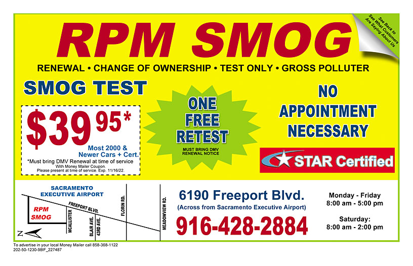 Smog 'n go elk grove coupon. Smog 'N Go - We get you in and out in a hurry! Take $10 off of your next smog check at any Smog 'N Go. You can either print out the coupon, or show us on your phone. 90-day Free Retest Worried that your car might not pass? If your car fails its smog test we will provide one free retest within 90 days. You can have your free retest done at any one of our Sacramento area smog check locations. $10 of a Smog Check at Smog 'N Go $10 of a Smog Check at Smog 'N Go Smog Check Coupon Either print this coupon or show us on your phone. Smog 'N Go Locations Smog 'N Go Locations. Elk Grove: Calvine and 99. Elk Grove and I-5. Fair Oaks. Folsom. Smog Check Pricing at Smog 'N Go Most Vehicles - 1996 to 1999: (cars, most minivans, trucks, diesel vehicles)